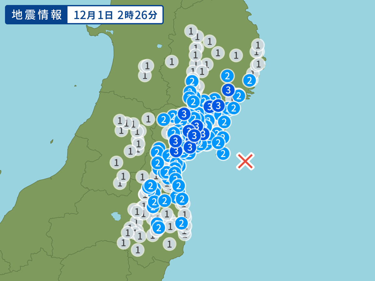 2025年12月01日 02時26分 奥州市で揺れを感じる地震が発生しました。