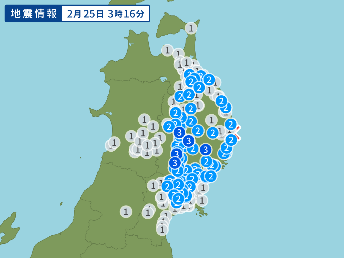 2026年02月25日 03時16分 奥州市で揺れを感じる地震が発生しました。