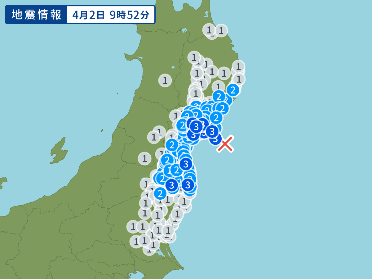 2026年04月02日 09時52分 奥州市で揺れを感じる地震が発生しました。